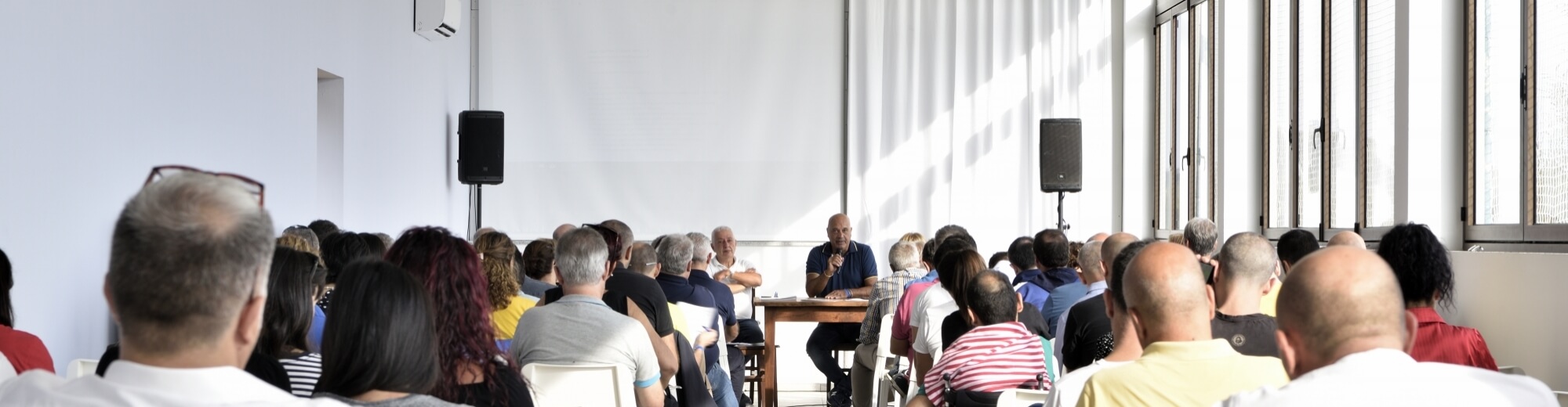 La sala congressi con luci soffuse e videoproiezione